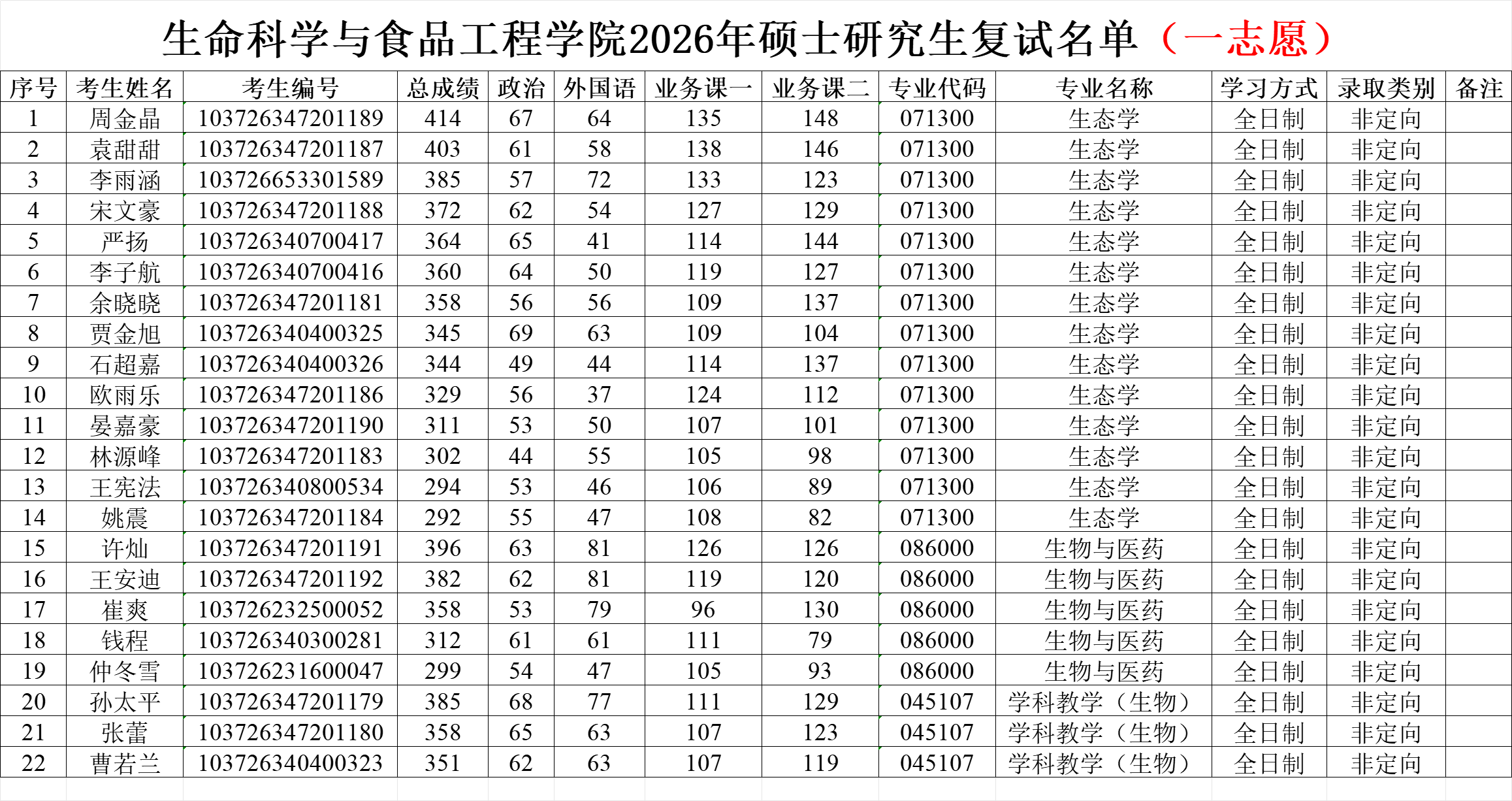 安庆师范大学生命科学与食品工程学院2026年硕士研究生复试名单(一志愿)