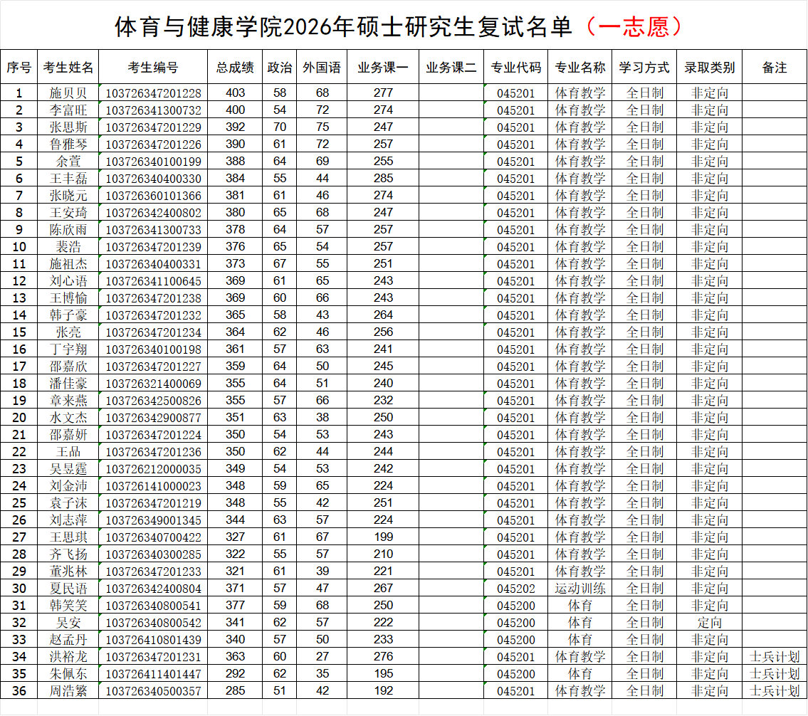 安庆师范大学体育与健康学院2026年硕士研究生复试名单(一志愿)