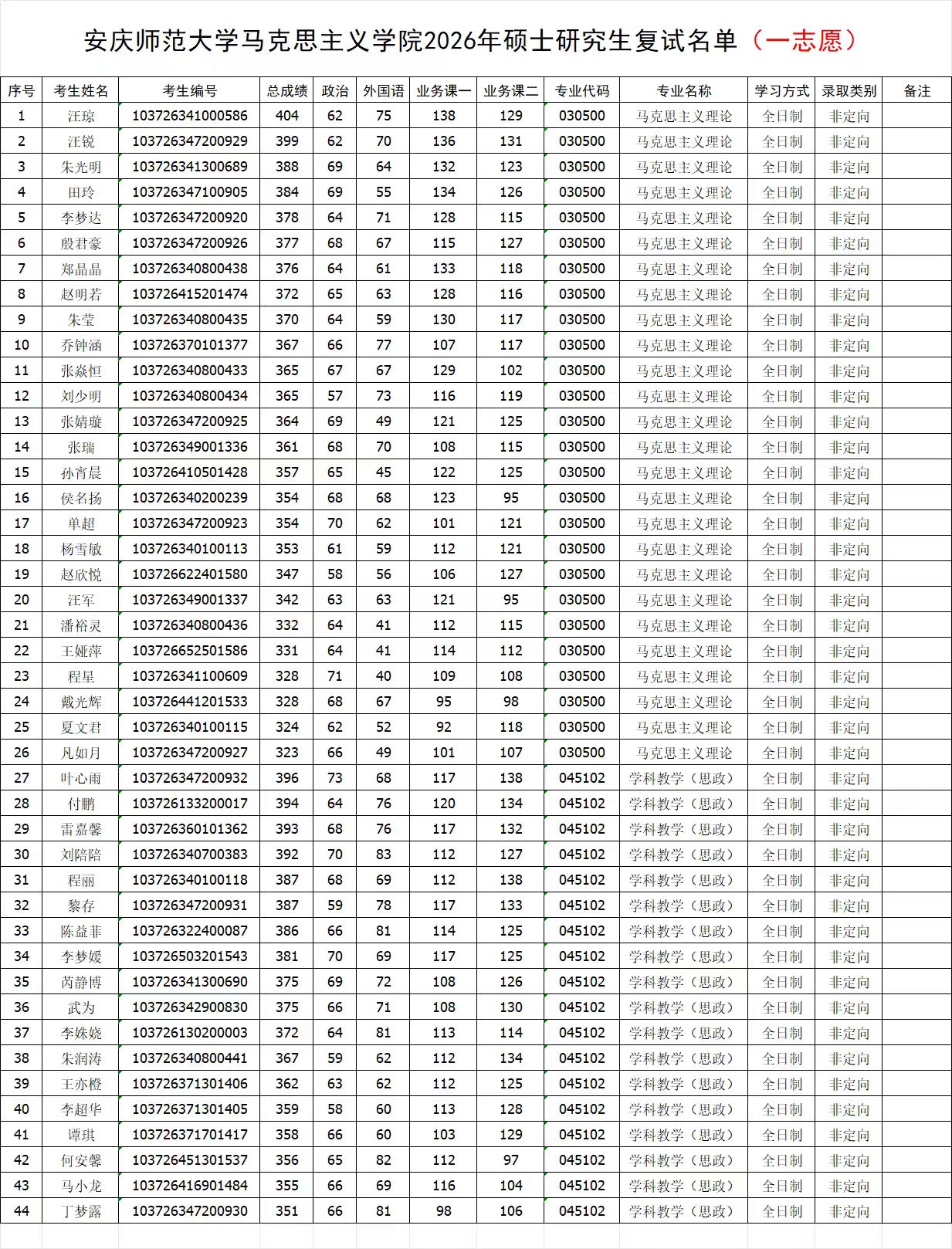安庆师范大学马克思主义学院2026年硕士研究生复试名单(一志愿)
