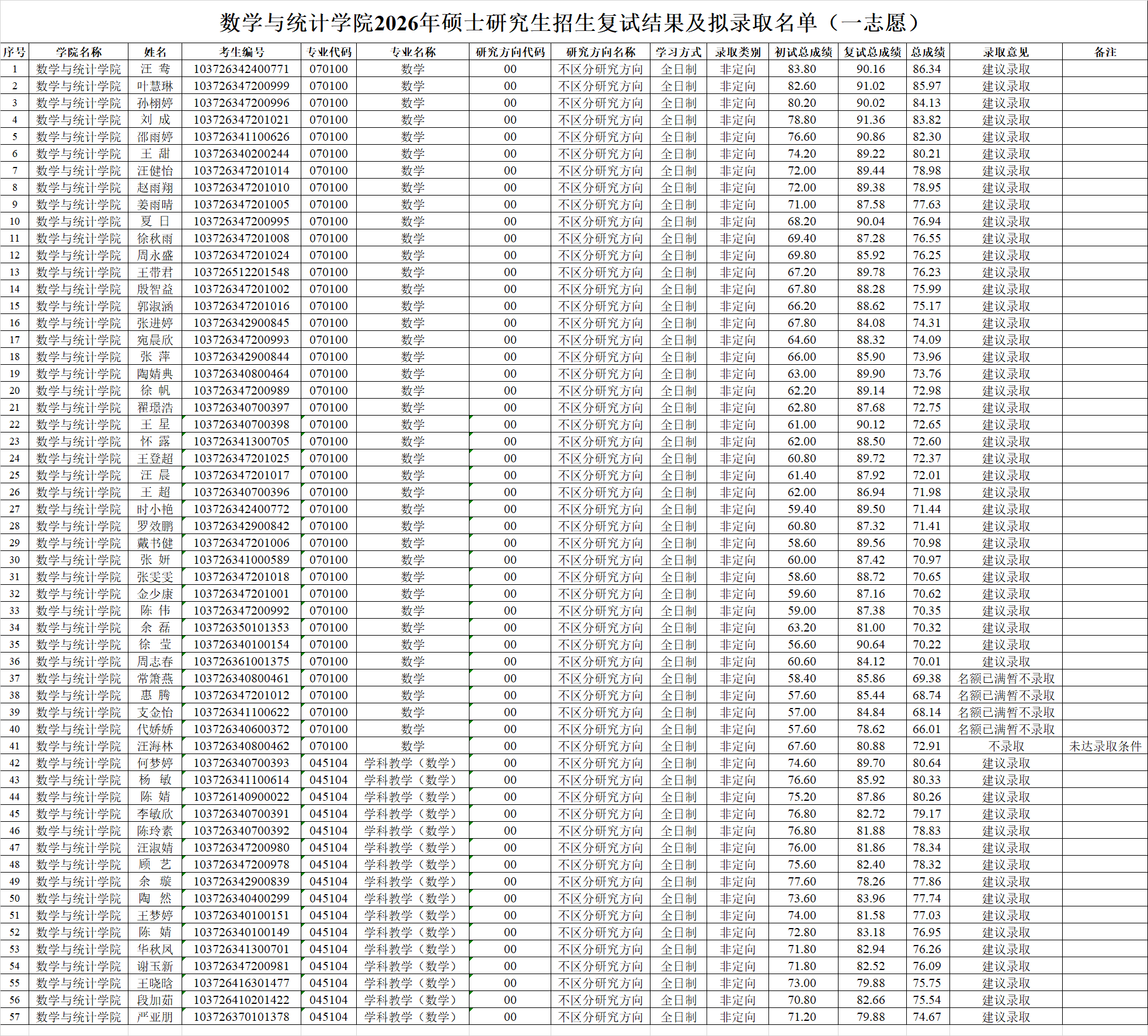 数学与统计学院2026年硕士研究生复试一志愿拟录取名单