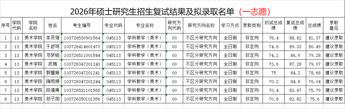 美术学院2026年硕士研究生复试一志愿拟录取名单