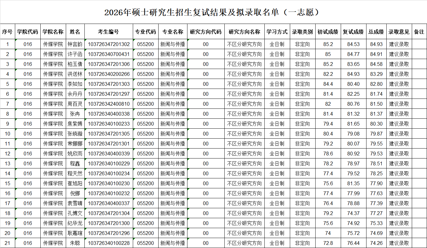 传媒学院2026年硕士研究生复试一志愿拟录取名单