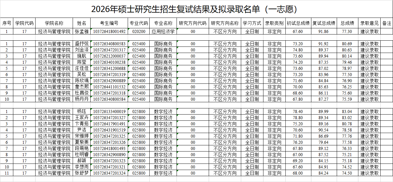 经济与管理学院2026年硕士研究生复试一志愿拟录取名单
