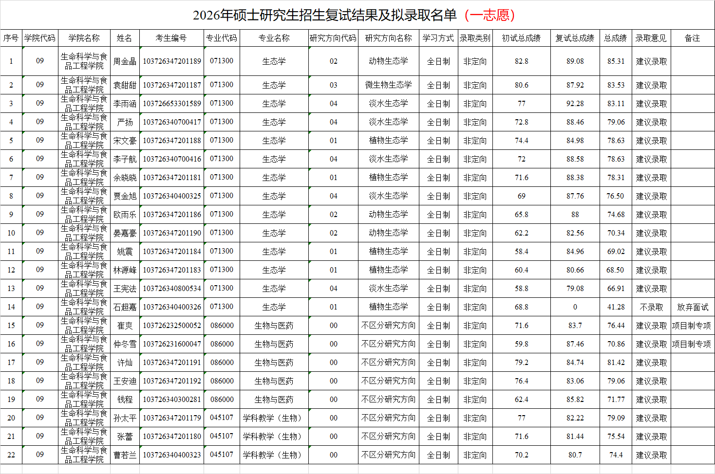 生命科学与食品工程学院2026年硕士研究生复试一志愿拟录取名单