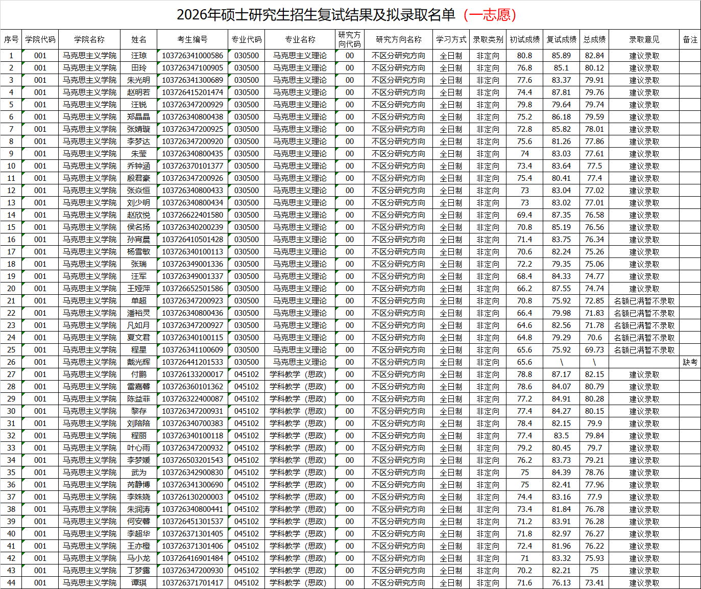 马克思主义学院2026年硕士研究生复试一志愿拟录取名单