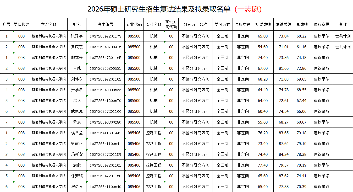 智能制造与机器人学院2026年硕士研究生复试一志愿拟录取名单