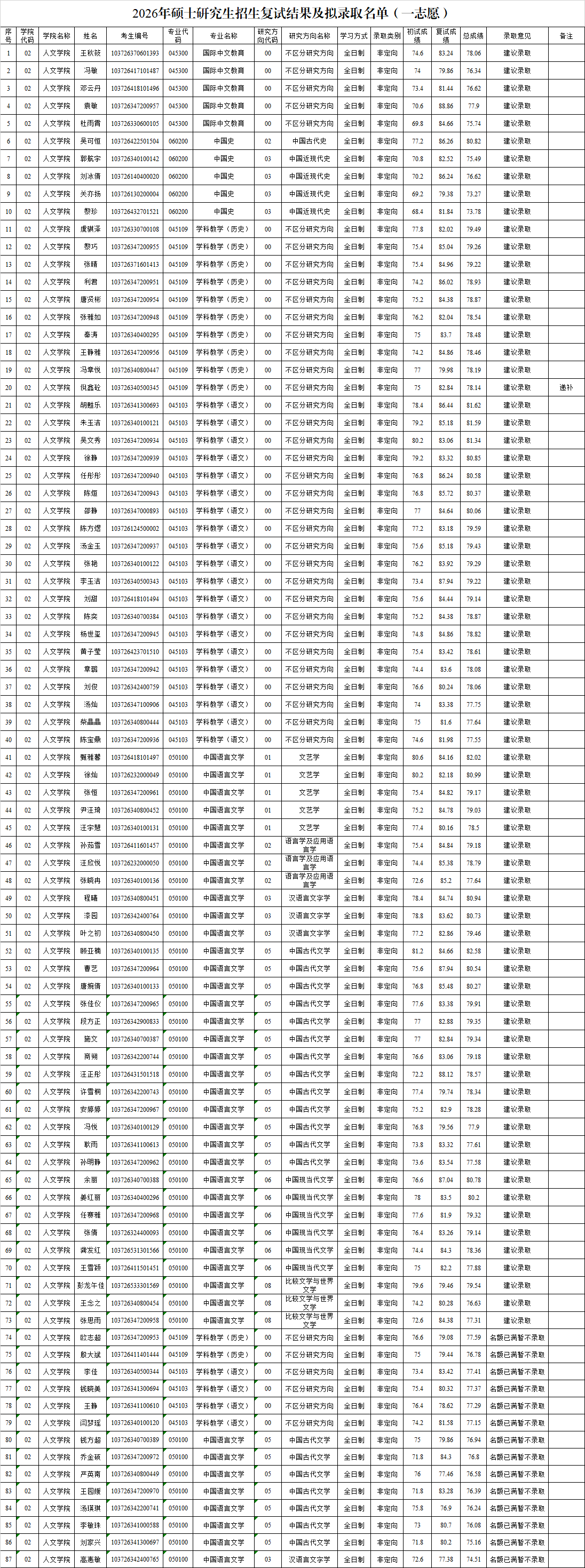人文学院2026年硕士研究生复试一志愿拟录取名单