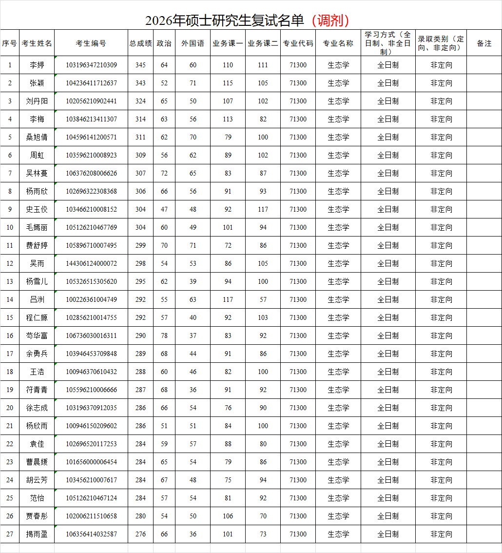 生命科学与食品工程学院2026年研究生招生调剂复试名单(生态学)