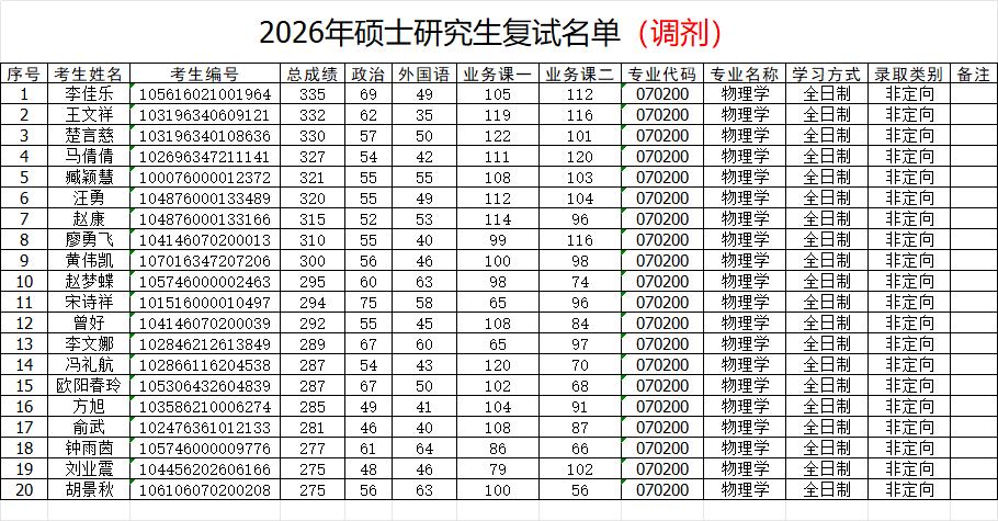 物理与天文空间学院2026年研究生招生调剂复试名单(物理学)