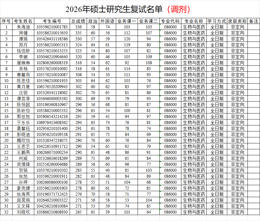 生命科学与食品工程学院2026年研究生招生调剂复试名单(生物与医药)