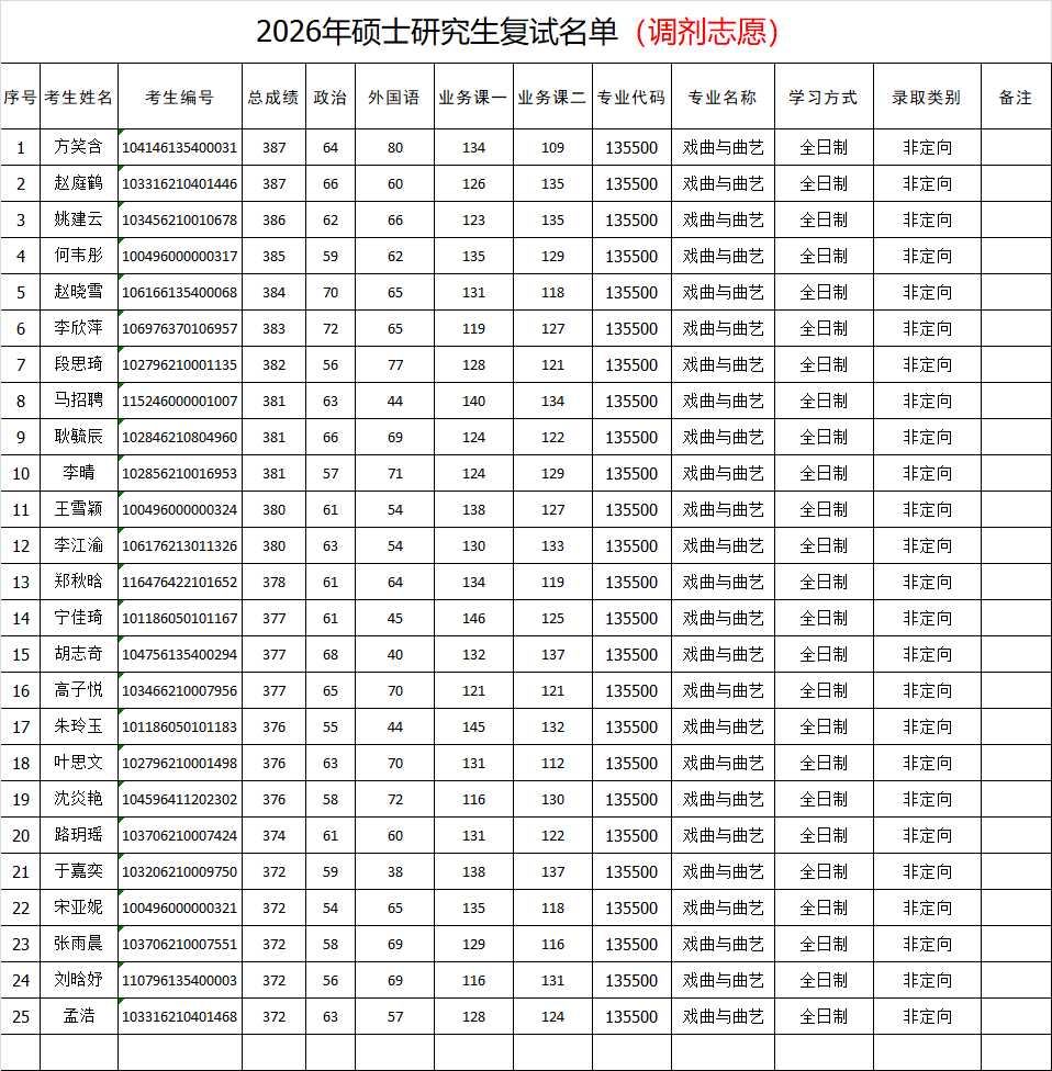 黄梅剧艺术学院2026年研究生招生调剂复试名单