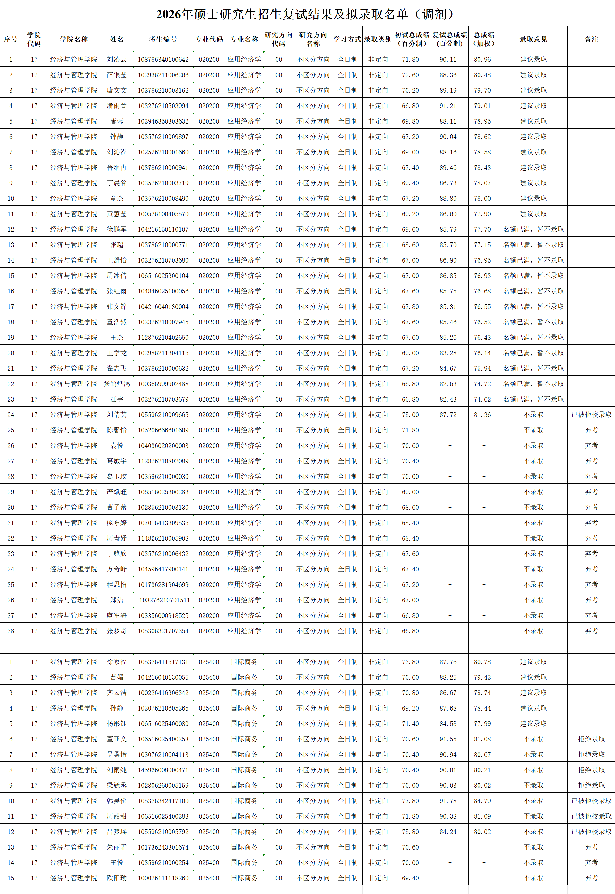 经济与管理学院2026年研究生招生调剂复试拟录取名单
