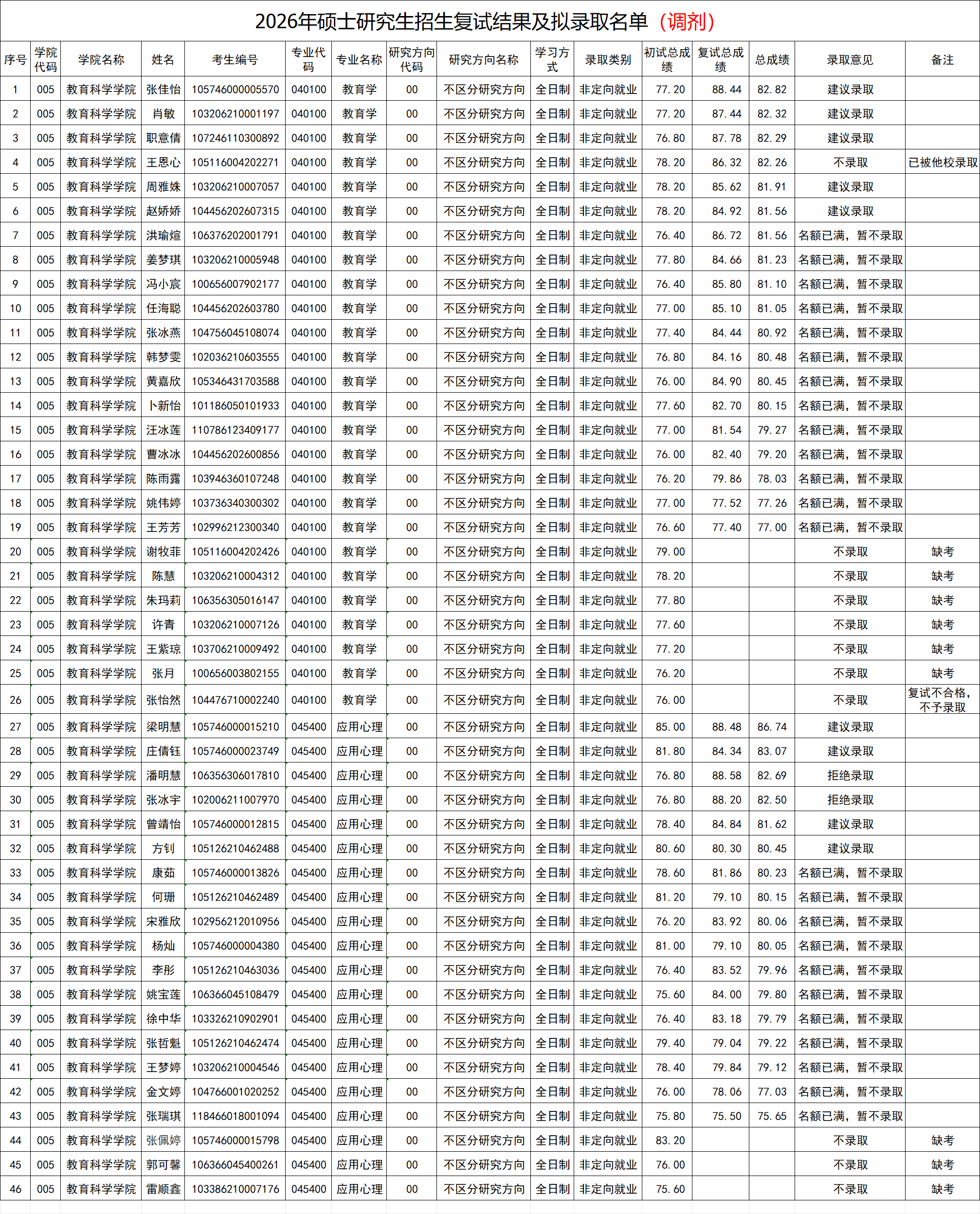 教育科学学院2026年研究生招生调剂复试拟录取名单
