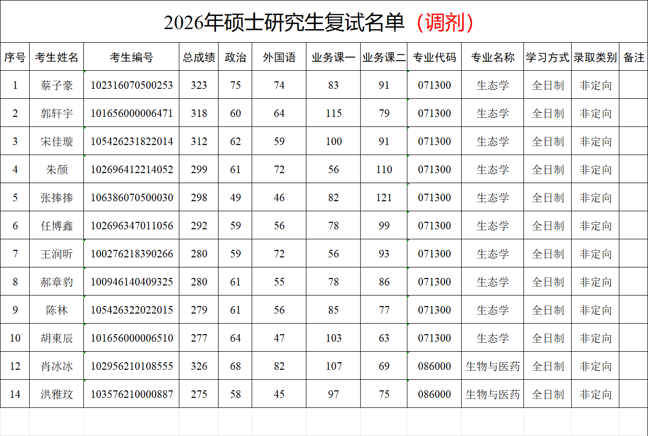 生命科学与食品工程学院2026年研究生招生调剂复试名单(第二轮)