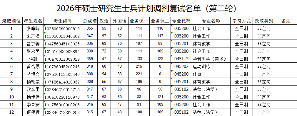安庆师范大学2026年硕士研究生士兵计划调剂复试名单(第二轮)