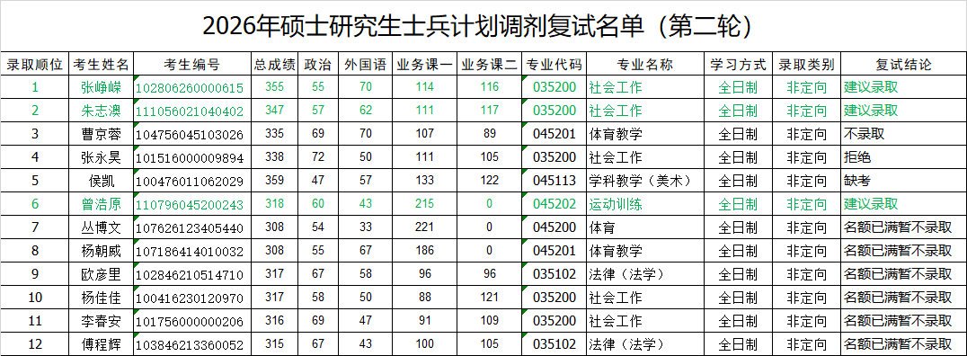 安庆师范大学2026年硕士研究生士兵计划调剂拟录取名单(第二轮)
