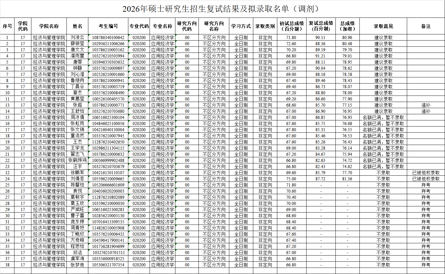 经济与管理学院2026年研究生招生调剂复试应用经济学拟录取名单(递补)